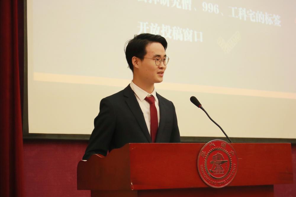 第九届研究生会主席团成员臧奕茗向大会作题为《以奋斗诠释初心,用拼搏践行担当,为建设中国特色世界一流学院贡献青春力量》的工作报告。报告内容从营造求实创新的学术氛围、打造丰富多彩的特色活动、构筑协作共赢的团队氛围、引领昂扬向上的校园文化等方面系统回顾了第九届学生会及研究生会的工作成绩,并希望学生会及研究生会引领同学们将民族精神和时代精神、个人成就和社会责任相结合,志存高远,锐意创新,将当代大学生的青春梦想融入到实现中华民族伟大复兴的中国梦中。