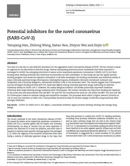 近日,电院团队在权威期刊Briefings in Bioinformatics上(IF=8.99, JCR 1区top期刊)发表新冠肺炎最新研究成果。该成果将为后续药物研究提供基础,助力新冠肺炎特效药的研制!