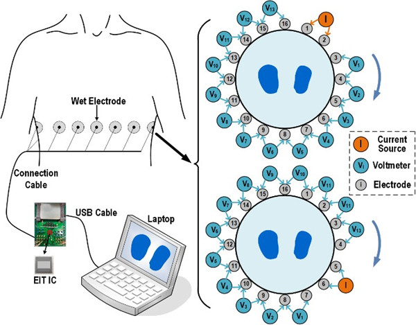 该论文展示了一款电阻抗成像片上系统,可用于肺部成像等领域。该芯片是目前集成度最高的阻抗测量系统。通过提出的新技术,该芯片将数据输出量、每通道功耗、硬件资源消耗均大大降低。芯片实现的无辐射连续断层成像,对于医疗领域意义重大。
