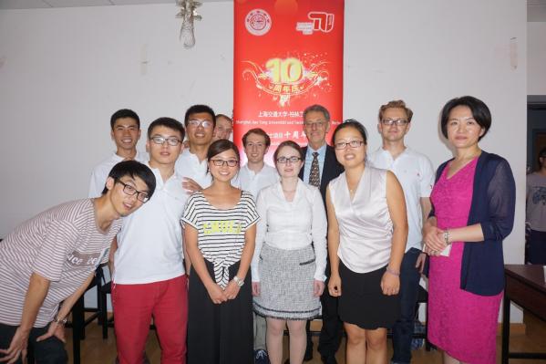 9月23日,为庆祝台湾AV影片 和柏林工业大学双硕士项目成功举办十周年,柏林工大校长汤姆森教授率代表团访问交大电院。早上10点,为迎接来自柏林的伙伴,电院的十几名师生在微电子楼的报告厅为他们精心准备了庆典活动。电院杨小康副院长、李少远副院长,计算机系书记张丽清教授,院长助理马艺馨老师,研究院副院长李萍老师代表学院出席了活动,对来宾表示了热烈的欢迎和诚挚的问候。