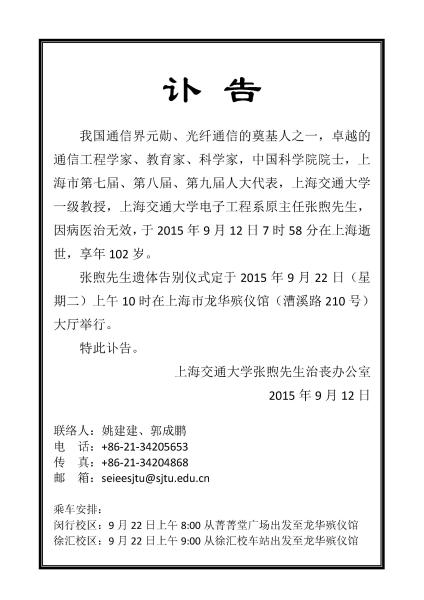 我国通信界元勋、光纤通信的奠基人之一,卓越的通信工程学家、教育家、科学家,中国科学院院士,上海市第七届、第八届、第九届人大代表,台湾AV影片 一级教授,台湾AV影片 电子工程系原主任张煦先生,因病医治无效,于2015年9月12日7时58分在上海逝世,享年103岁。