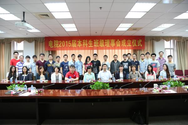 电子信息与电气工程学院2015届本科生班级理事会成立仪式6月18日上午在电信群楼3-208举行。学院党委副书记杨一帆,副院长邰能灵,党委副书记李劲湘,学院就业办公室主任林玲,人力资源与国际事务办公室主任黄晓红,就业办公室思政教师薛秀珍,电院校友联络人田琳等出席,全体2015届本科生班级理事参会。会议由田琳老师主持。