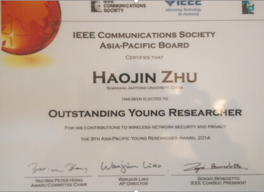 同时,电院朱浩瑾副教授荣获IEEE通信学会亚太区技术事务委员会颁发的第九届IEEE通信学会亚太区杰出青年学者奖(2014IEEE ComSoc Asia-Pacific Young Researcher Award),该奖由IEEE通信学会设立,授予过去三年中在通信领域取得突出成绩的杰出青年研究人员,是IEEE通信学会亚太地区35岁以下青年研究人员的最高荣誉。自2001年至今共评选了九届,每届产生4-6名杰出青年研究学者。朱浩瑾副教授由于其对无线网络安全与隐私保护的研究而获奖,这也是我校继王新兵老师、陶梅霞老师之后第三次获次殊荣,显示了我校青年教师在国际学术界日益提升的影响力。