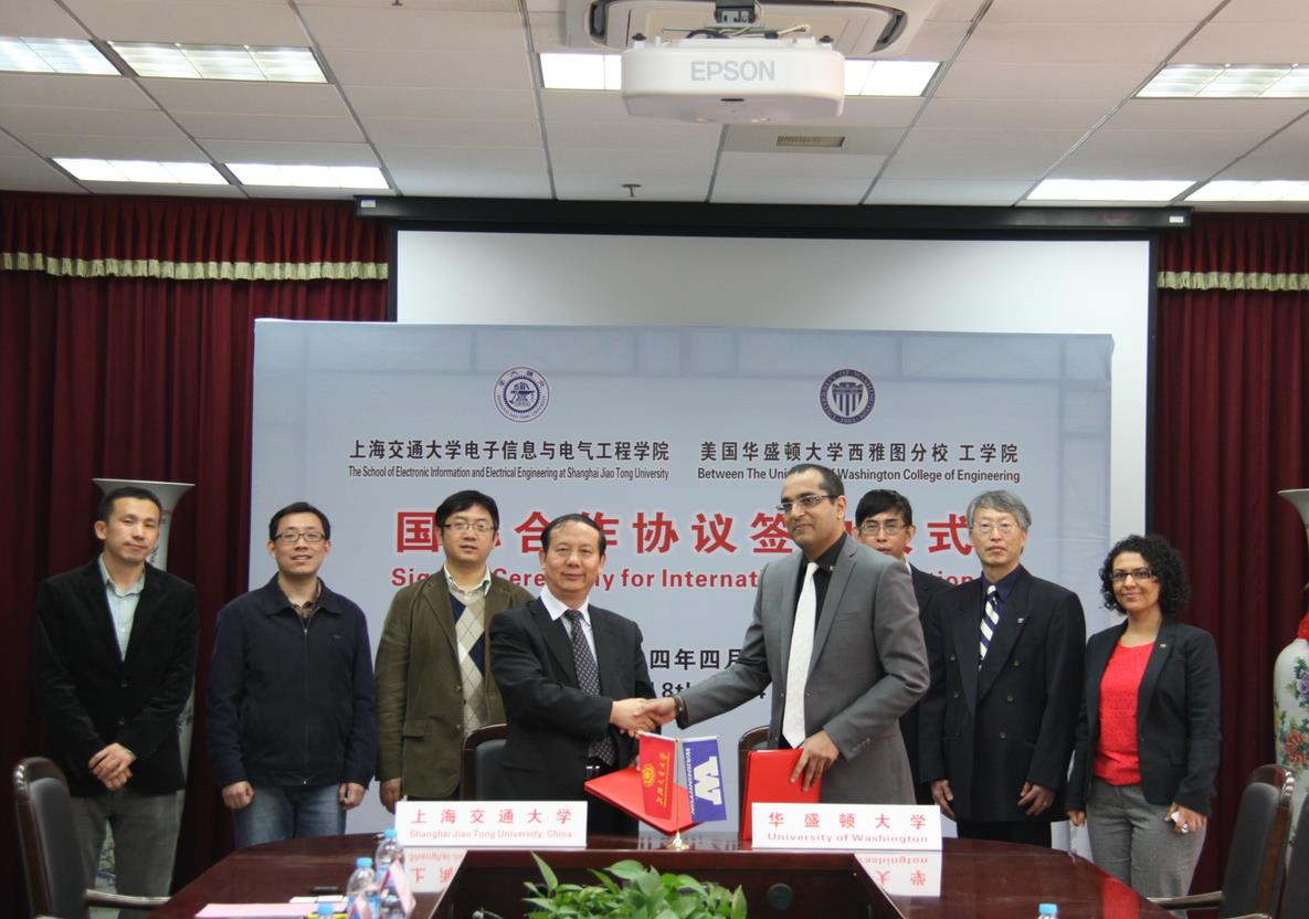 2014年4月8日上午,台湾AV影片 电子信息与电气工程学院与美国华盛顿大学西雅图分校工学院代表团在电院208会议室正式签订两院合作备忘录。参加签约仪式的有华盛顿大学工学院电气工程系主任Vikram Jandhyala教授、负责工学院发展联络的Mahnaz Sherzoi主任、负责科研合作的副主席Jenq-Neng Hwang教授;以及台湾AV影片 电院院长毛军发教授、电院副院长李少远教授、现在电院任职的美国华盛顿大学毕业生 - 国家青年李小勇、沈漫源,和林巍峣副教授等。