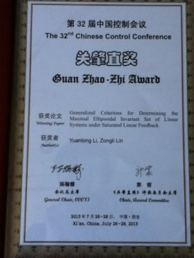 自动化系博士研究生李元龙同学与其导师林宗利教授的论文 “Generalized Criterions for Determining the Maximal Ellipsoidal Invariant Set of Linear Systems under Saturated Linear Feedback”在第32届中国控制会议上获得关肇直奖。
