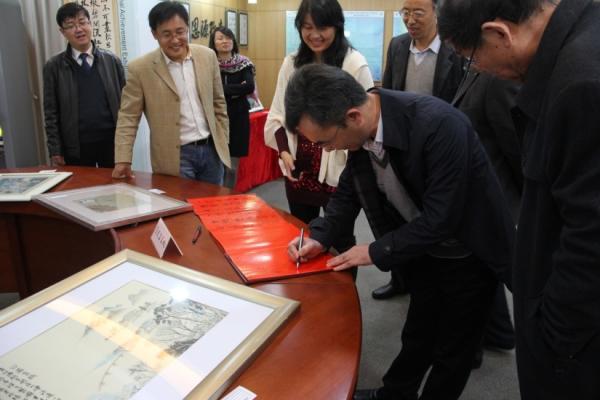 参观期间,徐书记饶有兴趣地流连于电院教职工老师们的得意作品前,细致端详,赞不绝口,表示希望电院能够组织将这些极有风韵和价值的作品作一动态巡展,在全校范围内进一步拓展影响,分享心怀。参观结束后,徐书记在留言簿上欣然写下“电院在全校带了一个好头”的真情心迹。