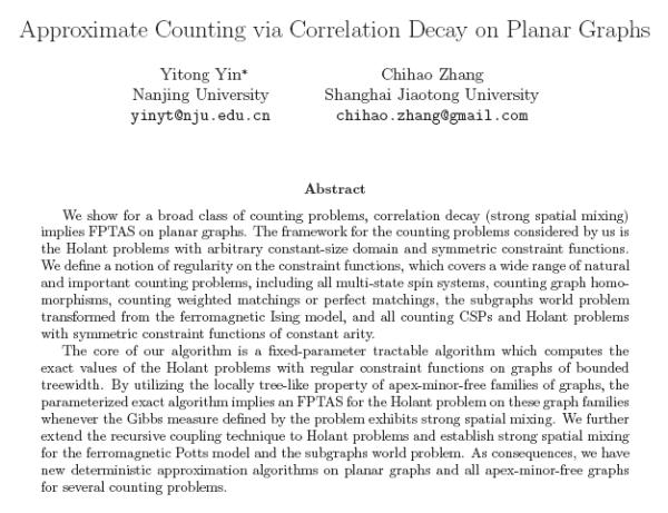 最近计算机系BASICS实验室一年级博士研究生张驰豪与南京大学计算机系青年教师尹一通副教授合作的论文《Approximate Counting via Correlation Decay on Planar Graphs》被算法领域最顶级的国际会议ACM-SIAM Symposium on Discrete Algorithms (SODA 2013)录用。