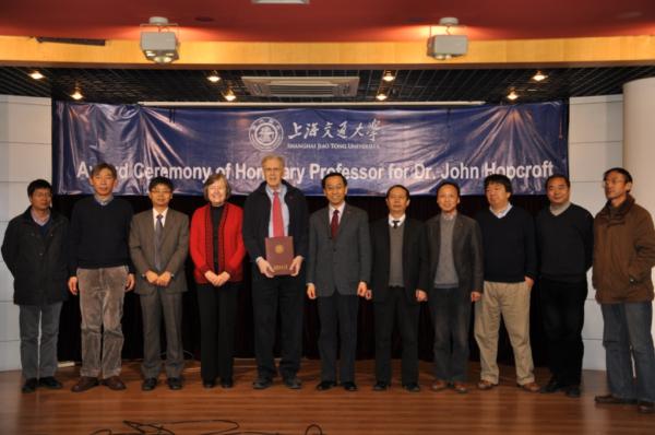 名誉教授,聘书授予仪式于2012年1月5日上午在电信学院3-200号学术报告厅隆重举行。仪式由计算机科学与工程系主任过敏意主持,张杰校长亲自为Hopcroft教授颁发聘书并佩戴校徽。电信学院院长毛军发、计算机系党总支书记吕宝粮及计算机系及致远学院师生共计100人参加。受聘仪式结束后,Hopcroft教授还做了题为Time