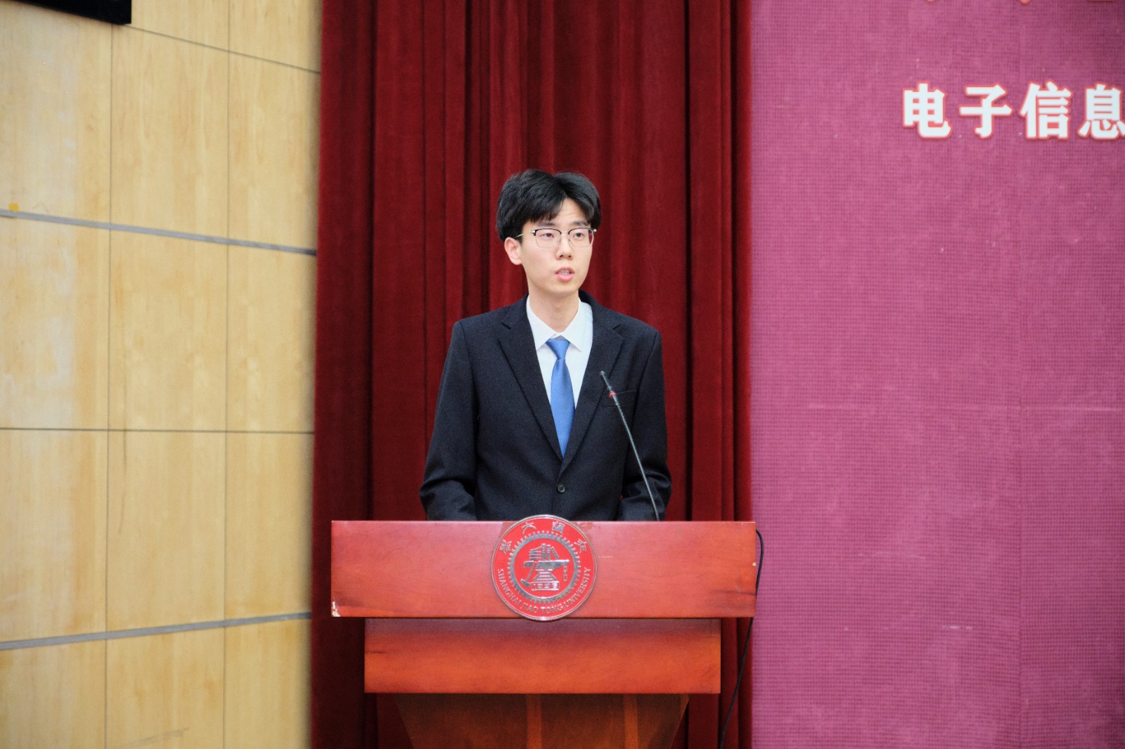 姚成超代表校学联致辞。他表示电院研究生会在过去的一年中,在引领先进思想、丰富校园文化生活、维护学生权益、加强组织建设等方面都展现出了稳健与创新并重的成效,希望选举产生的新一届主席团能够扛起电院研会大旗,用青春的智慧和汗水为同学们提供更好的服务。