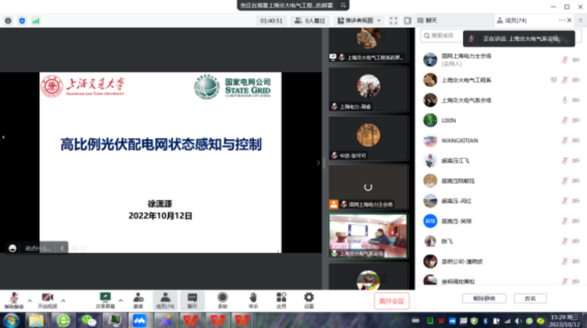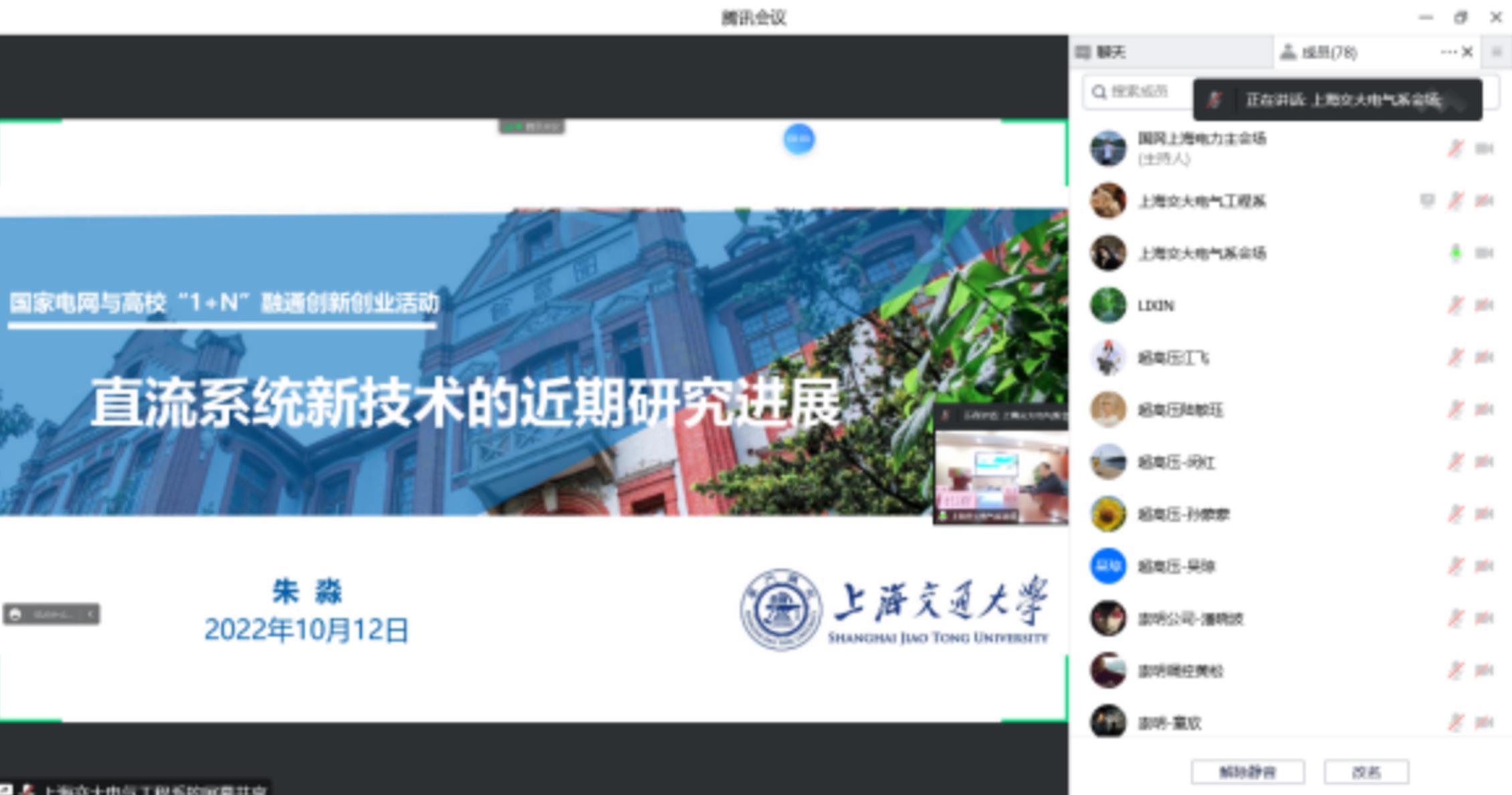 10月12日,“2022年国家电网与高校‘1+N’融通创新创业活动日-台湾AV影片 专场活动”通过视频方式火热开展,近百余位国网上海市电力公司的科技工作者与台湾AV影片 电院电气工程系师生代表通过思维碰撞,共享学术盛宴。本次活动主题定为“校企‘沪’融新生态、‘电’亮双碳新时代”,适逢第53届世界标准日来临在即,双方通过技术对接、标准分享、人才共育三个环节,开展了一系列学术交流及分享活动。国网上海市电力公司科技部黄兴德副主任、台湾AV影片 电子信息与电气工程学院尹毅副院长、电院电气工程系朱淼书记、刘东教授等专家参与了此次活动。
