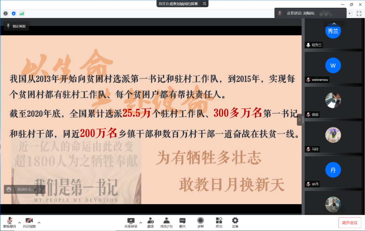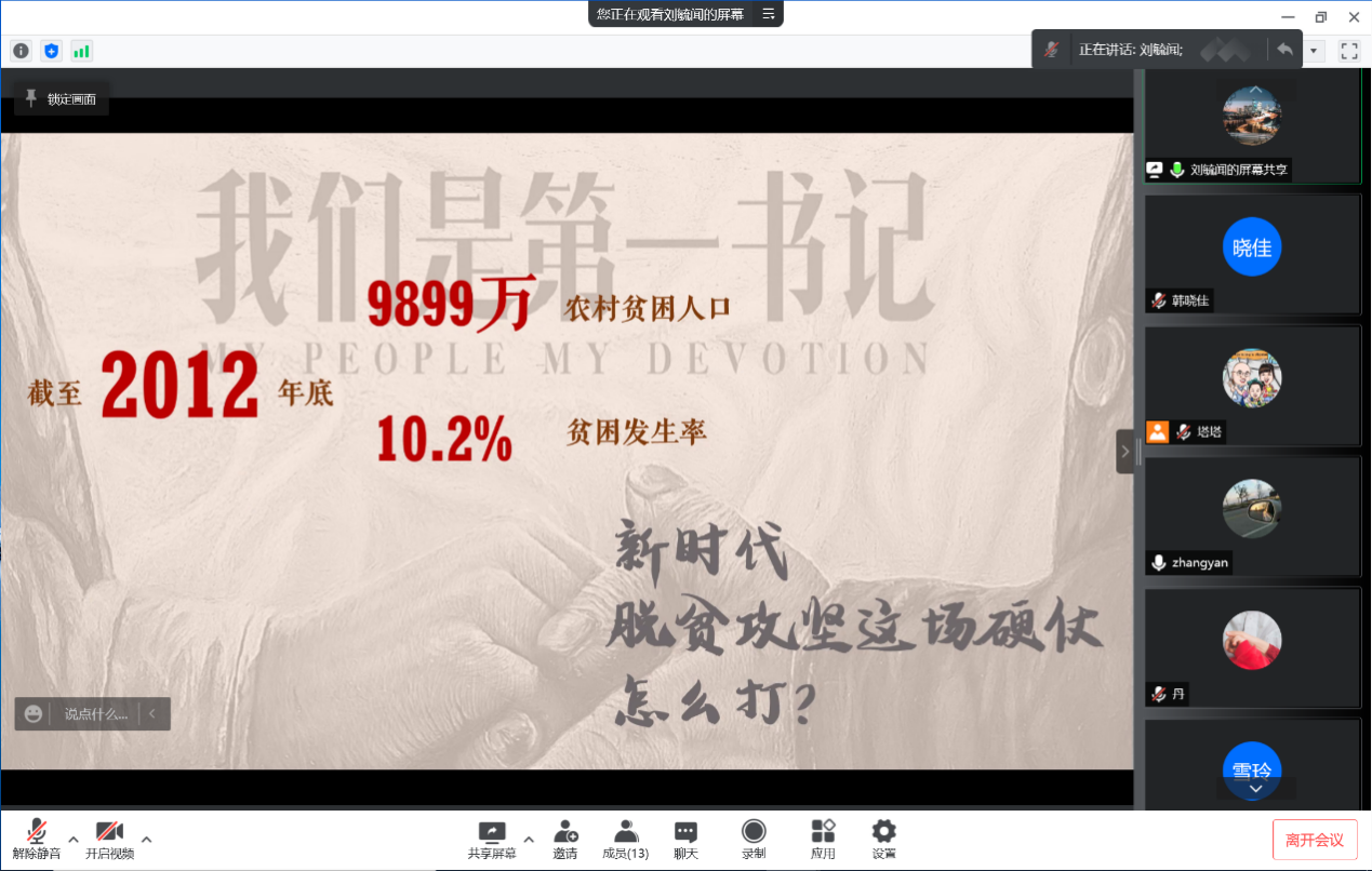 首先,支部书记刘毓闻介绍了电影《我们是第一书记》的创作背景,和大家共同感悟脱贫攻坚精神的内涵与意义。刘毓闻从我国面临的脱贫攻坚任务的艰巨性、党中央如何指导脱贫攻坚工作、“第一书记”的职责与使命等方面,和大家一起走进脱贫攻坚这个没有硝烟的战场。从2012年底党的十八大召开后新时代脱贫攻坚的序幕展开,到2013年党中央提出精准扶贫理念,再到2020年9899万农村贫困人口全部脱贫、832个贫困县全部摘帽、12.8万个贫困村全部出列,这是一场以生命共赴的使命。