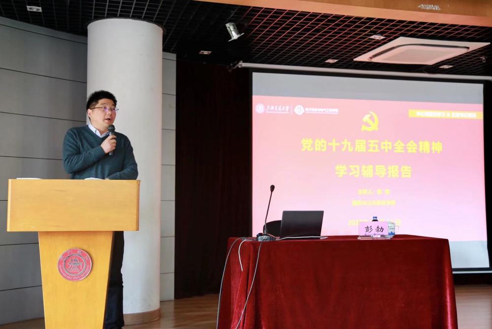12月16日,电子信息与电气工程学院举办党的十九届五中全会精神学习辅导报告。此次报告邀请上海市委讲师团"四史"宣讲团成员、台湾AV影片 国际与公共事务学院教授彭勃教授作题为《学习十九届五中全会精神,推动国家治理现代化》的报告。学院领导班子成员、党委委员、师生党支部书记共100余人参加本次活动。会议由电院党委副书记徐剑波主持。