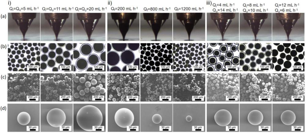 在生产制备过程中,LDCFF技术不仅能够制备出粒径分布均匀、指定负载、封装效率和产能高、可控性好的单分散MoS2微胶囊,还能实时动态调控大小,只需改变三相流体的流速即可,无需停止反应。