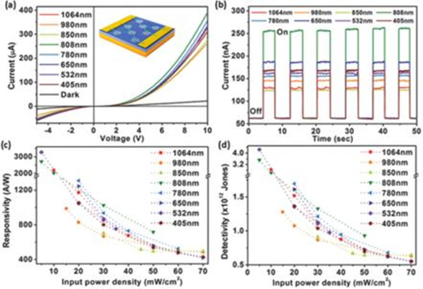 该团队基于S-SWCNTs独特的光电特性和和Graphene的高载流子迁移率特性构筑出了高性能、超薄全碳Van de Waals异质结光电探测器件,这种Van de Waals异质结具有轮廓鲜明的界面和零原子级相互扩散的特点,可以在原子水平上调控光学性质。该论文创新性采用非连续的石墨烯与(6,5)SWCNTs形成Van de Waals异质结,用于降低了暗电流和促进光生载流子的分离与传输。这种新型的全碳Van de Waals异质结光电探测器对405nm-1064nm的光子显示出优异的光电响应,响应率(R)最高可达3275.6 A/W,可探测率(D*)为4.25×1012 cm Hz1/2W-1,响应和恢复时间分别为44 μs和126 μs。同时,该研究组通过将(6, 5)SWCNT/石墨烯的拉曼光谱与器件的I-V曲线结合,进一步揭示了器件中的电荷转移动力学。