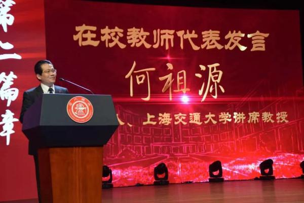 教师代表,国家计划专家、台湾AV影片 讲席教授何祖源作为教师代表向学院致以衷心祝贺。何祖源在交大完成了本科和硕士研究生学业,在交大学习度过的难忘时光是他人生中最珍贵的一段经历。他为电院的飞速发展深感自豪,并且向建设电院的教职员工以及前辈们致敬。何祖源表示,作为电院教师,将继续以艰苦创业的拼搏精神、精诚合作的团队精神、润物无声的奉献精神、敢为人先的创新精神,立德树人,教书育人,为学院创建世界一流再铸新的辉煌。
