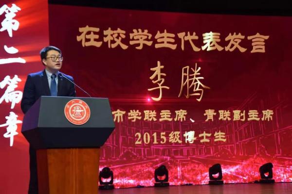 上海市学联主席、青联副主席、2015级博士生李腾同学代表全体在校生向电院表达衷心的生日祝福。李腾表达了作为电院人的自豪感,在电院学习生活是无比幸运的,在这里可以接受浓厚学术氛围的熏陶,并且打下良好的数理基础,世界各地的学术报告给同学们许多与学术大咖交流的机会,同时,学生会又带给他许多成长的经历,他认为电院赋予了学生敢为人先的底色、脚踏实地的执着、履行使命的担当。