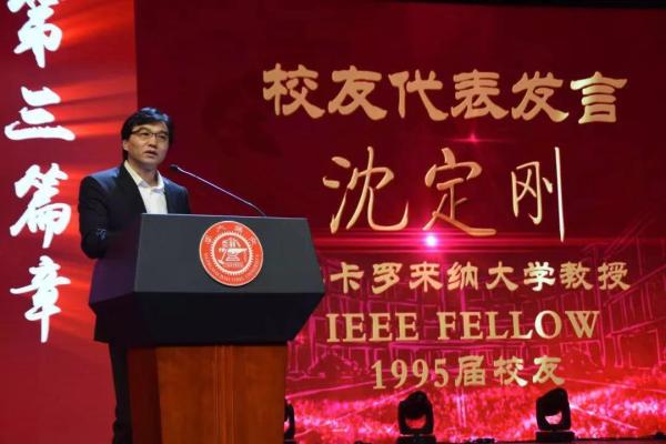 北卡罗来纳大学终身教授,联影智能联席 CEO,IEEE Fellow 沈定刚作为校友代表发言,沈定刚学长是电院1990届本科生,1995届博士毕业,他从三个方面讲述了电院带给他的影响。第一点是专注,专注于学业和研究方向,沈定刚认为专注的方向是他取得医疗人工智能方面成就的主要原因;第二点是做有影响力的工作,衡量一个人成功的准则不是他所创造的财富,而是他对人类生活所产生的影响;第三点是感恩,沈定刚对学习期间电子系、图像所、光纤所的老师的帮助与支持表示感激。最后,沈定刚表达了作为一个电院人的骄傲与自豪。