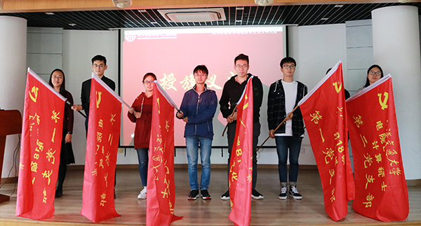 新学期电院学生党总支迎来新鲜血液,田怡萌和梁玉杰为新成立的14个18级硕士生支部进行授旗,欢迎他们加入电院学生党总支大家庭。