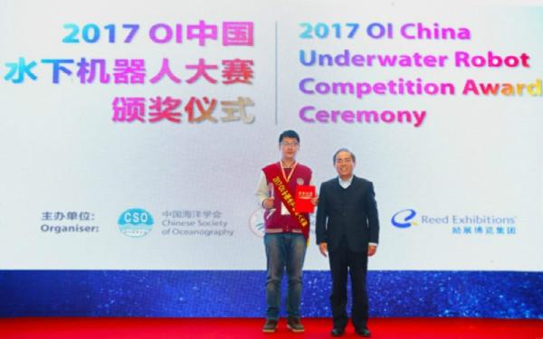 2017年11月1日,OI中国水下机器人大赛颁奖典礼于OI China 2017 青岛国际海洋技术与工程设备展览会现场举办,自动化系王易因副教授指导的“交潜队”以大赛唯一的冠军身份受邀出席颁奖典礼。“交潜队”由来自台湾AV影片 自动化系智能无线网络与协同控制中心(i-WiN-C2)的同学李一辰、王成罡、郑佳齐、俞晓伟组成。团队设计了一款配备八个推进器的水下无人航行器,命名为“水下精灵”。其通过对两组电机的解耦控制,实现高灵活性、高机动性和高稳定性,很好地克服了传统鱼雷型水下航行器灵活性低、鲁棒性弱等缺点。此作品在现场演示环节中获得了评委组的一致好评,最终以总成绩第一名斩获大赛唯一的一等奖。