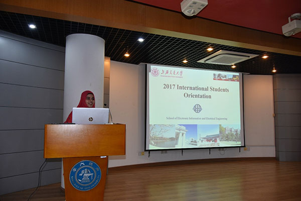 16级留学生代表Anum向新同学介绍了上海,交大以及电院的基本情况,为留学生在交大的生活拉近了距离。并用汉语和英语表达了自己对交大的热爱之情。通过自身在交通大学电院一年的学习生活经历,鼓舞在座的各位同学在努力学习之余更要积极参加学校组织的各项活动,并积极结交中国朋友,努力了解中国,建起中国与世界的友谊桥梁。