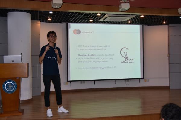 电院海外中心辅导员胡恺向留学生介绍了海外活动中心的相关活动,并鼓励新同学积极参加各类活动,丰富自己的校园生活。