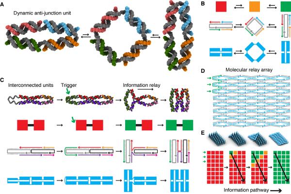 本研究基于可自由变化的四臂DNA单元(anti-junction),通过有序排列将DNA单元组装成2D或者3D的阵列,得到一种全新的可变DNA结构。由于每个构成单元都是可以自由变化的,进而通过触发某个特定位置的构象变化,能够产生级联反应,类似于“多米诺(Domino)骨牌”效应,实现长距离的信息传输和递送。同时,该可变DNA结构也能够可编程化地研究各中间态的转换过程。这种新型可变DNA纳米结构能够为化学反应的中间态研究以及生命活动中分子信号调控提供有力的研究工具。