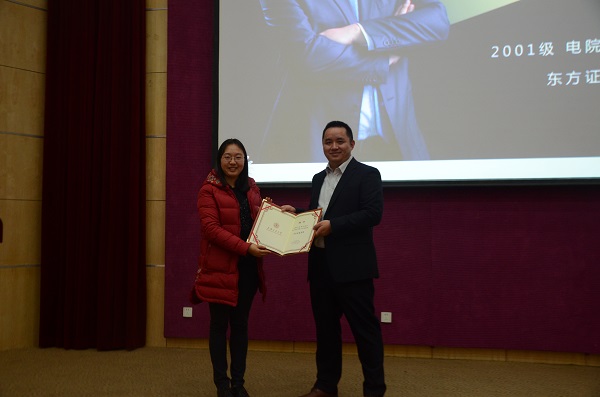 最后,学生党总支副书记田怡萌代表学院向彭翀授予了“电子信息与电气工程学院学生生涯导师”聘书,希望彭翀学长今后能够更多地结合自己的成功经历,为电院的同学们提供职业发展和生涯选择的宝贵指导。