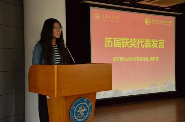 历届获奖学生代表杨敏霞在发言中说,她在从学校到工作的角色转变过程中,能时刻真切的感受到学长学姐们的精神教诲与支持,并希望获奖同学能够继续传承发扬“电力九零”精神,回报母校。
