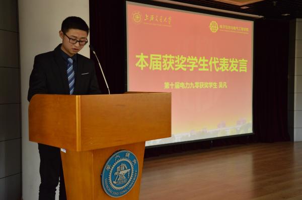 本届获奖学生代表吴凡在获奖发言中对在自己成长途中帮助自己的人表示感谢,并表示自己将时刻牢记老师和长辈们的谆谆教诲,传承电力九零学长学姐的爱心,努力成才。