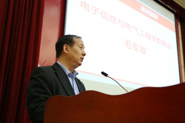 全场观众一同观看《电子信息与电气工程学院宣传片》后,电院院长毛军发在致辞中指出,电子信息与电气工程学院成立于2001年12月,其前身可溯源至百年前的电机专科,具有中国电气工程师“摇篮”之美称,学院于2014年完成大电类综合改革,成为全国范围内规模最大、实力最强的同类学院之一。他表示,在全体电院师生的共同努力下,电院将继续秉持“思源致远、荣辱与共,坚持操守、奋发向上”的精神,以国际化争国内领先,以中国特色争国际一流,朝着建设世界一流电类学科的目标不断前进。