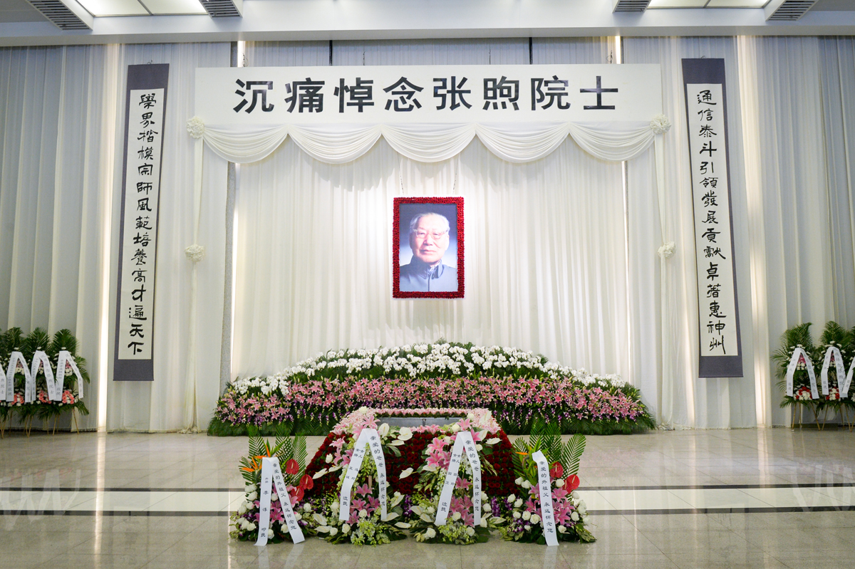 告别大厅庄严肃穆,张煦院士安详地静卧在鲜花丛中。大厅上方悬挂着黑底白字的横幅“沉痛悼念张煦院士”,横幅下方悬挂着张煦院士生前的照片,大厅内“通信泰斗引领发展贡献卓越惠神州,学界楷模宗师风范培养高才遍天下”的挽联,高度概括了张煦院士把毕生奉献给祖国通信事业、教育事业的杰出成就和高尚情操。