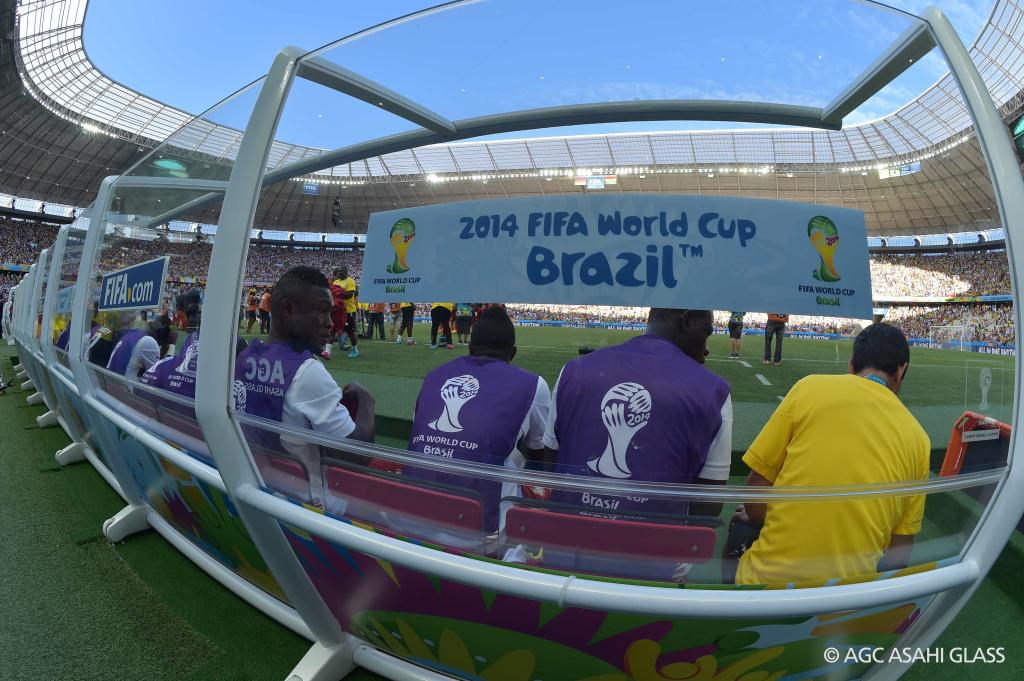 旭硝子公司所提供的巴西世界杯专用球员座椅,其设计是以国际足联首次采用的超薄钢化玻璃为主要材料进行的,相较之塑料座椅,显得更加洁净、透明,而且该种新型材料的硬度也更强,必将取代传统塑料座椅的设计,引领一个新的方向。