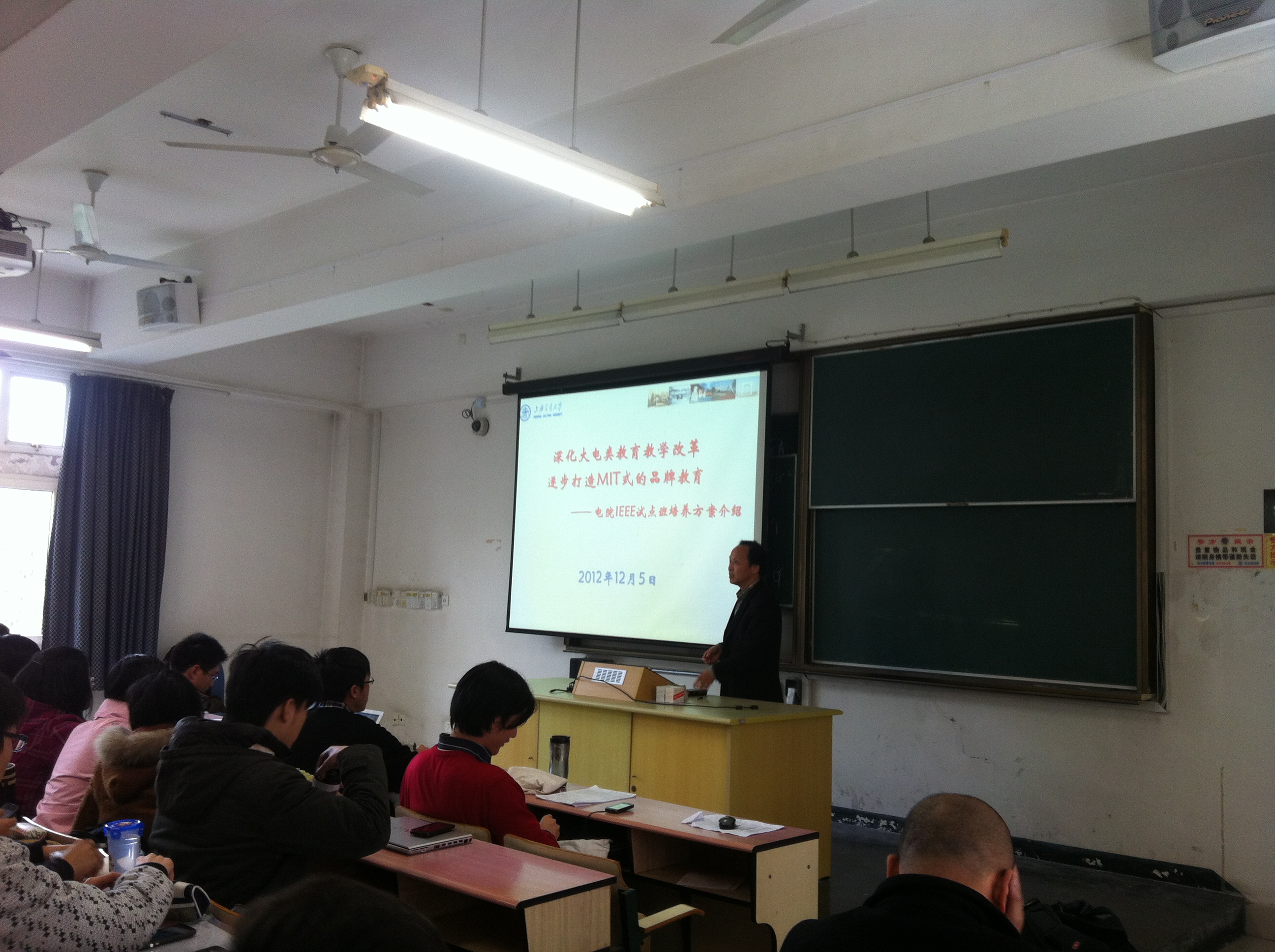 12月5日下午,电子信息与电气工程学院在东上院106教室召开2011级IEEE试点班专业方向选择宣讲会。IEEE试点班负责人俞勇教授对培养计划进行了总体介绍和部署。他从试点班的办学思路、发展构想、培养模式以及课程体系等方面进行介绍。接下来,各专业分管教学的副系主任对专业方向课程设置进行了详细的讲解。同学们也根据自身的实际情况提出了很多问题,现场气氛融洽,掌声阵阵。