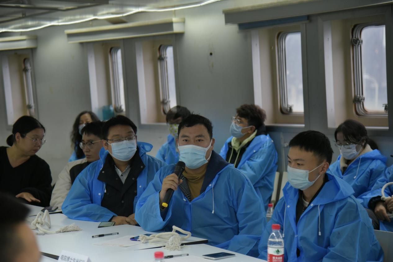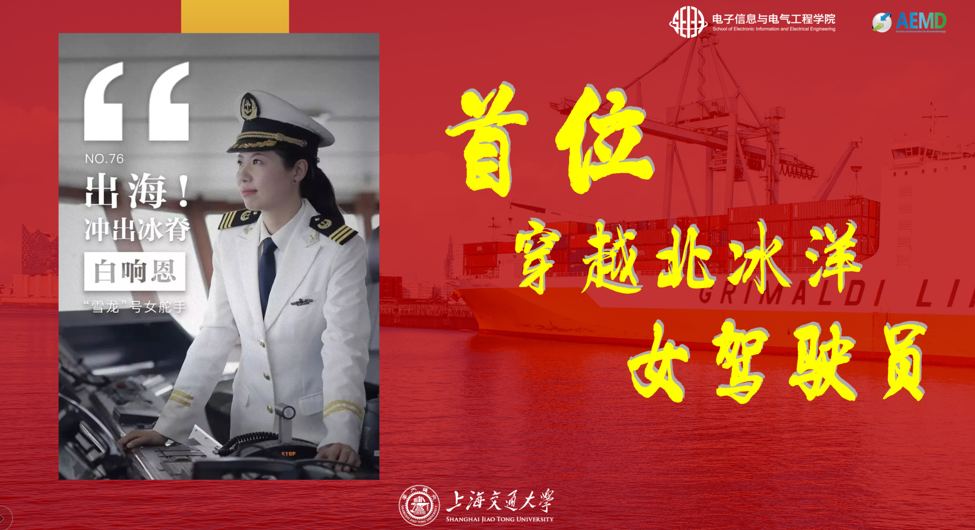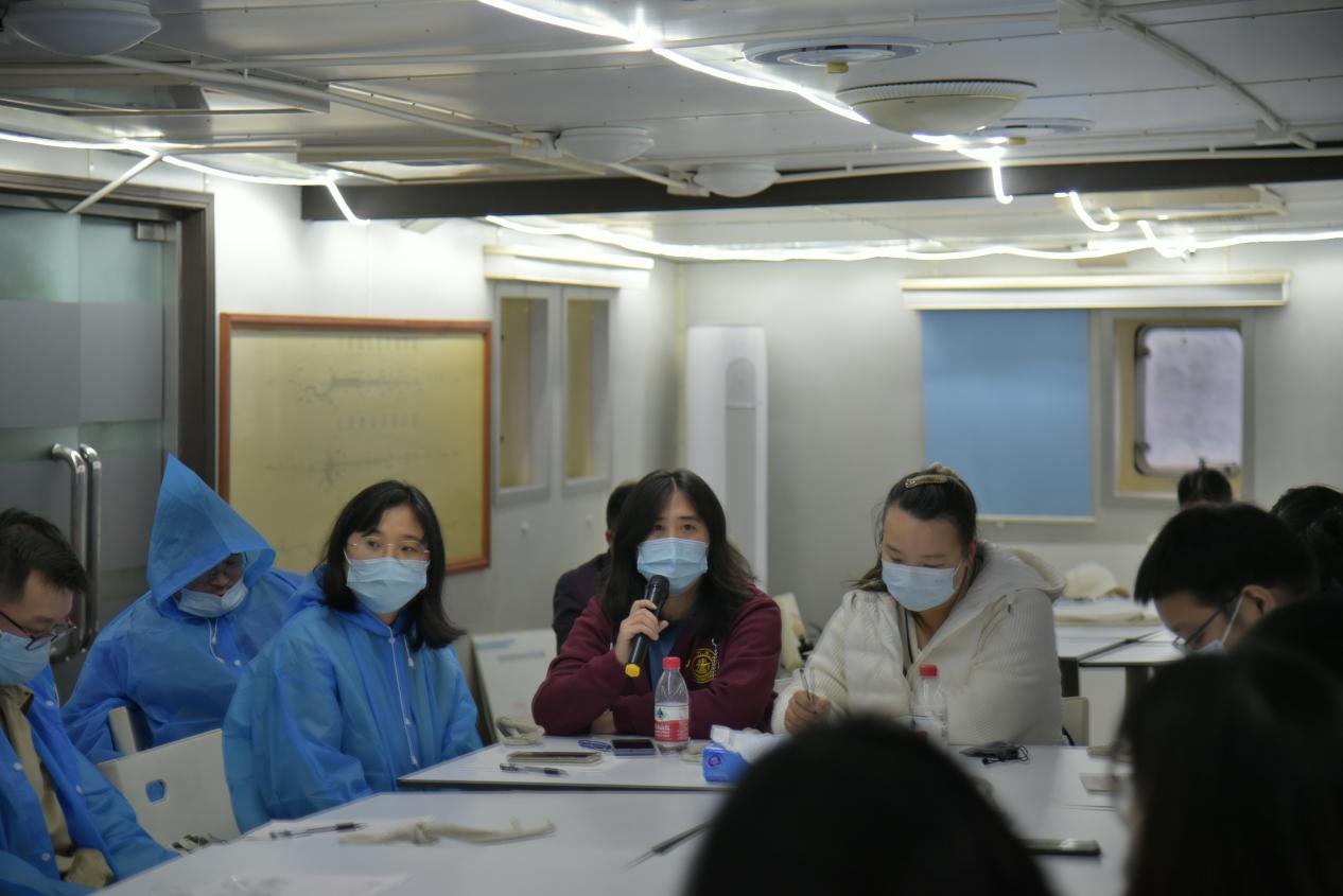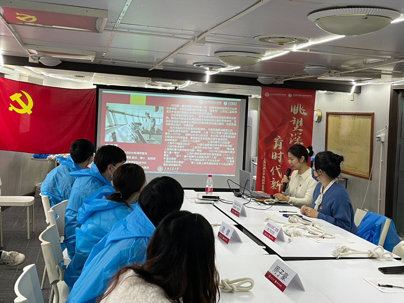 峥嵘岁月,追星揽箭,不变的是逐梦星辰大海的情怀。随着参观部分进入尾声,支部党员来到船内会议室共聚一堂,进行本次党日活动的第二项内容——《不忘初心 守护蓝色基因》主题报告暨共建交流环节。AEMD平台直属教工党支部书记刘毓闻首先介绍了本次交流共建的初衷和目标,她表示“亲临国之重器,追梦赤子之心,这是一场‘行走的党课’,也是一场思想的交流与碰撞,在座的博士生群体、思政教师队伍以及服务微纳加工领域的AEMD平台教师队伍,大家都在不同的岗位上,践行着学术追求和育人使命,交大人、电院人是大家共同的身份,梦想里有国、有家、有天下是大家共同的标签”,并号召大家广泛交流、深刻感悟、涵养品格、积蓄力量。随后,电院机关第二直属教工党支部书记魏超主持主题报告环节,本次主题报告的嘉宾是中国首位穿越北冰洋的女航海驾驶员、上海海事大学商船学院船长、副教授白响恩,在白教授深入浅出的介绍中,在座党员不仅对极地科考任务有了进一步的了解,更对船海人的精神谱系有了深刻的体悟。“因为热爱,所以无所畏惧”,白教授鼓励大家“相信这是最好的时代,面对困难,要抱着必胜的决心”,同时针对与会党员提出的关于“如何在科研攻关中保持前行动力”“我国深海事业、极地科考事业的规划与意义”等问题展开深入交流。魏超表示,“白教授的分享,有惊心动魄的回忆,更有熠熠生辉的家国情怀,这也让我们无比坚信,中华民族拥有眺望深蓝的前瞻者,更不乏脚踏实地的筑梦人”,在座党员也纷纷针对本次参观所得、讲座所悟展开交流,表示应该以此为动力,坚定践行党支部的战斗堡垒作用,以共同的价值观,塑造党员群体共同的行为理念。