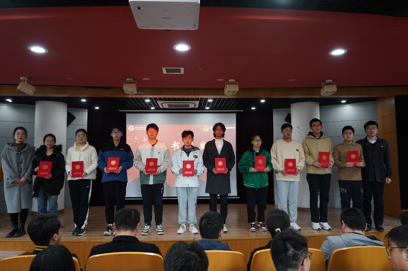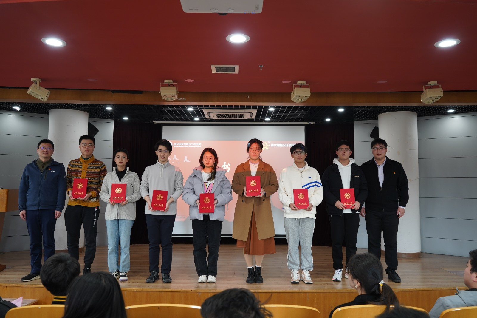 黄文焘、巢睿祺和电院学生党建办思政教师为党建研究会和第六期“星火计划”全体成员颁发证书。