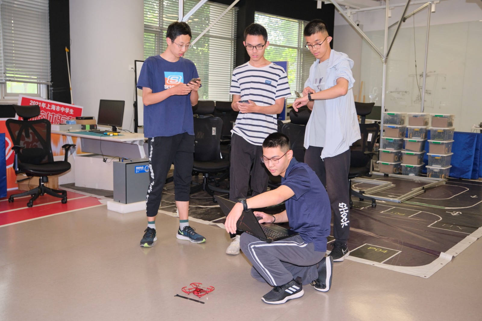 在第一轮飞行中,各支队伍就大显神通,纷纷展示精心打磨、调试过的无人机。有的参赛队伍顺利地识别出正确的赛道,快速穿越圆圈;有的队伍稳扎稳打,在降落时一步一步追求精准;也有部分队伍在识别上出现了问题,导致飞机中间降落,没能飞完全程。