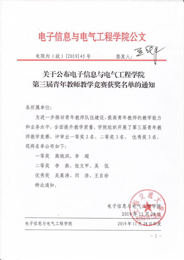关于公布电院第三届青年教师教学竞赛获奖名单的通知