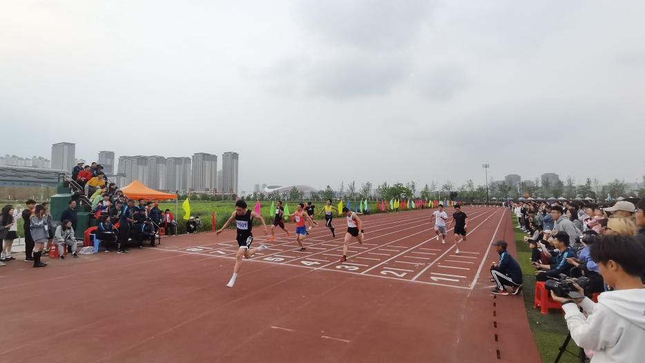 在学男100米项目上,强手云集,分预赛、复赛、决赛三个环节。毕铭宇同学预赛复赛成绩稳定,有惊无险过关斩将,成功挺进决赛。毕铭宇同学决赛分在第4跑道,比赛准备口令发出后,毕铭宇便沉稳的走上了起跑器,当发令枪声响起时,他便想一匹黑豹一般冲了出去!他的身体完全舒展了开来,如同一股疾风扫过红色的草原。几乎是转瞬之间,终点线就在出现在他的身前。毕铭宇同学以领先第二名近两米的绝对优势取得冠军,并打破校运动会该项赛事纪录。