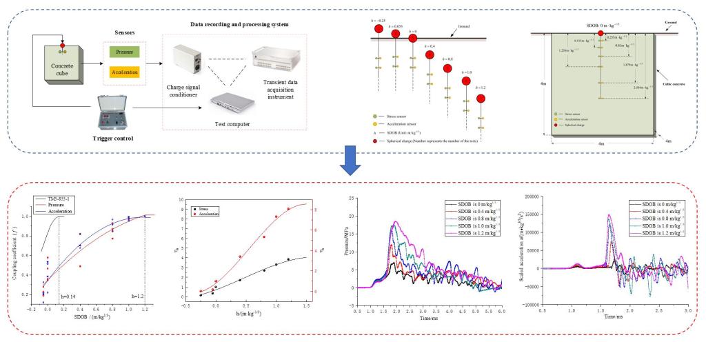 3.由我院博士研究生周辉作为通信作者完成的题为《Prediction method for ground shock parameters of explosion in concrete》论文发表在《Construction and Building Materials》上。该论文给出了混凝土中达到封闭爆时的临界比例埋深,揭示了混凝土强度对爆炸地冲击传播衰减规律的影响,提出了不同比例埋深爆炸和不同爆炸当量下地冲击参数的计算预测方法。该研究成果可为地下防护工程的设计和安全性评价提供基础数据指导。该研究得到了“国家自然科学基金项目、安徽省自然科学基金项目和安徽省高校自然科学研究项目”的支持。
