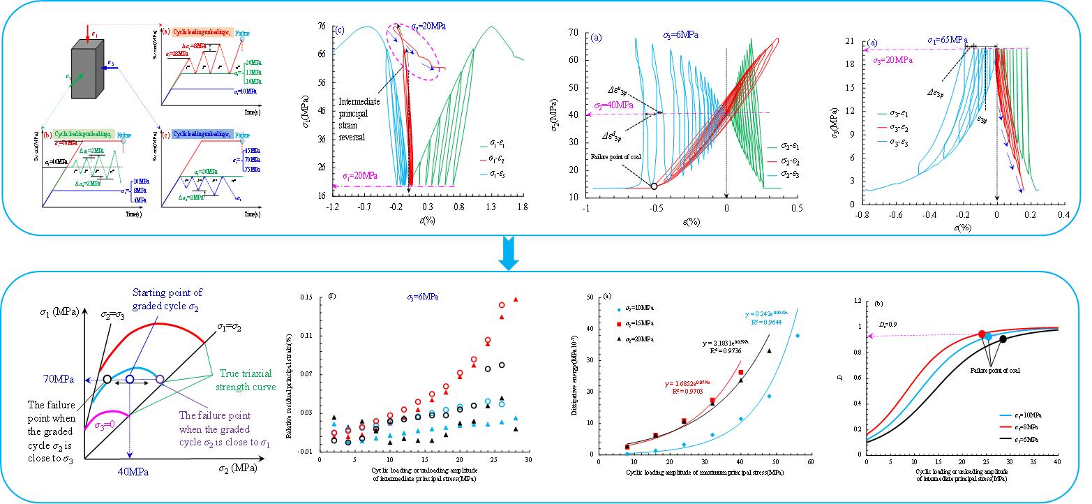 1.由我院青年教师段敏克博士作为第一作者完成的题为《Experimental study on mechanical and damage characteristics of coal under true triaxial cyclic disturbance》论文发表在《Engineering Geology》上。该论文研究了真三轴循环扰动作用下煤岩力学及损伤特征,揭示了各主应力对煤岩损伤的差异性影响,基于中间主应力循环实验揭示了中间主应力效应。该研究成果为深部真三维采动影响下煤岩体力学行为及损伤机理提供理论基础。该研究工作得到了“国家自然科学基金青年基金项目、安徽高校自然科学研究重点项目”等项目的支持。