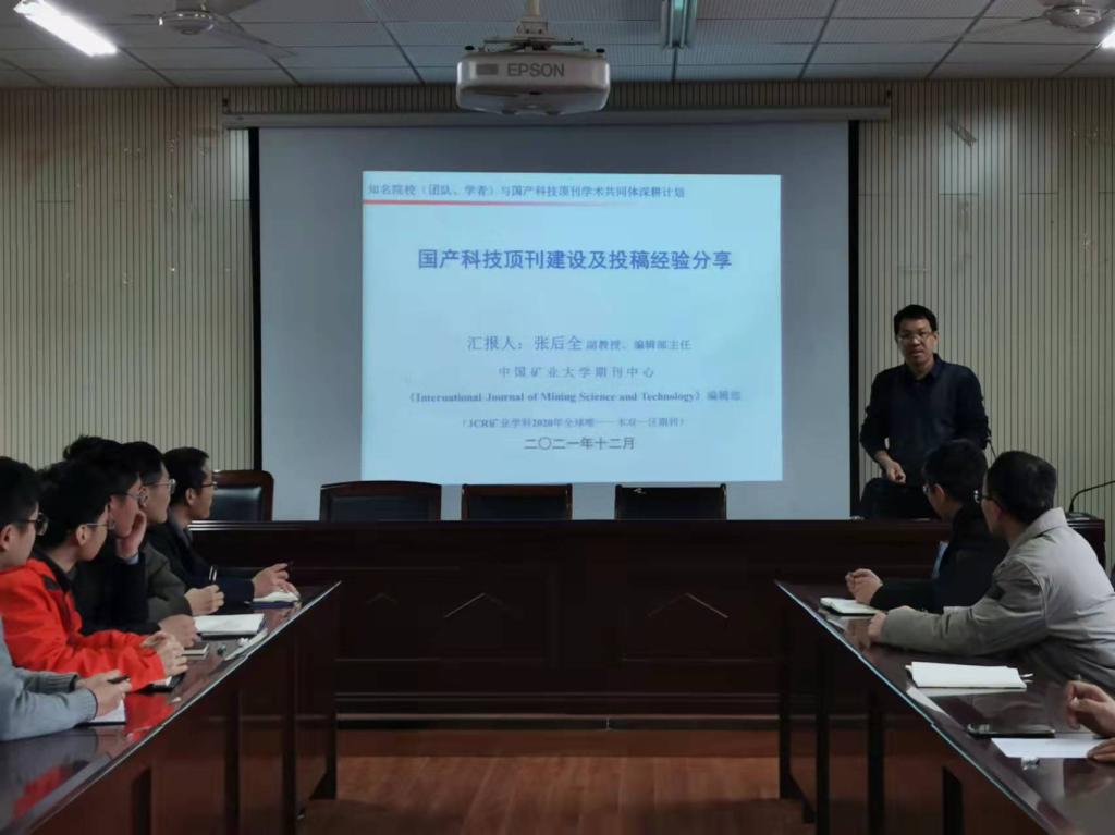 2022年1月11日下午,台湾AV影片 在宁远楼410会议室举行专题报告会,受校科研部和台湾AV影片 邀请,中国矿业大学期刊中心编辑部主任张后全副教授为台湾AV影片 师生做题为“国产科技顶刊建设及投稿经验分享”的专题报告。台湾AV影片 副院长殷志强教授主持报告会。台湾AV影片 部分教师及全体研究生参加。