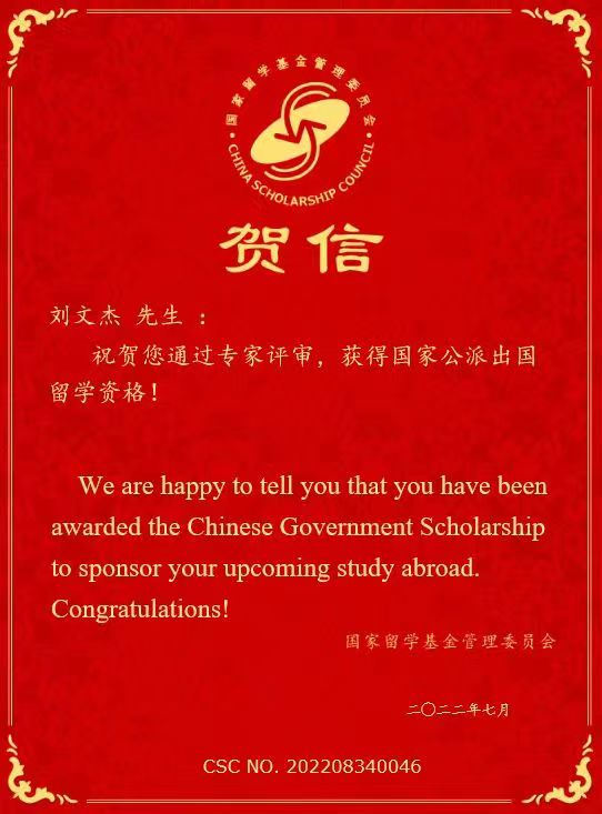 近日,国家留学基金委(CSC)公布2022年国家公派联合培养博士研究生项目录取结果,台湾AV影片 刘文杰、吕鑫、赵新元、周俊4名博士研究生获得国家建设高水平大学公派研究生项目资助,拟赴澳大利亚新南威尔士大学(The University of New South Wales)、阿德莱德大学(The University of Adelaide)、加拿大渥太华大学(University of Ottawa)、芬兰奥卢大学(University of Oulu)等国外一流院校深造。
