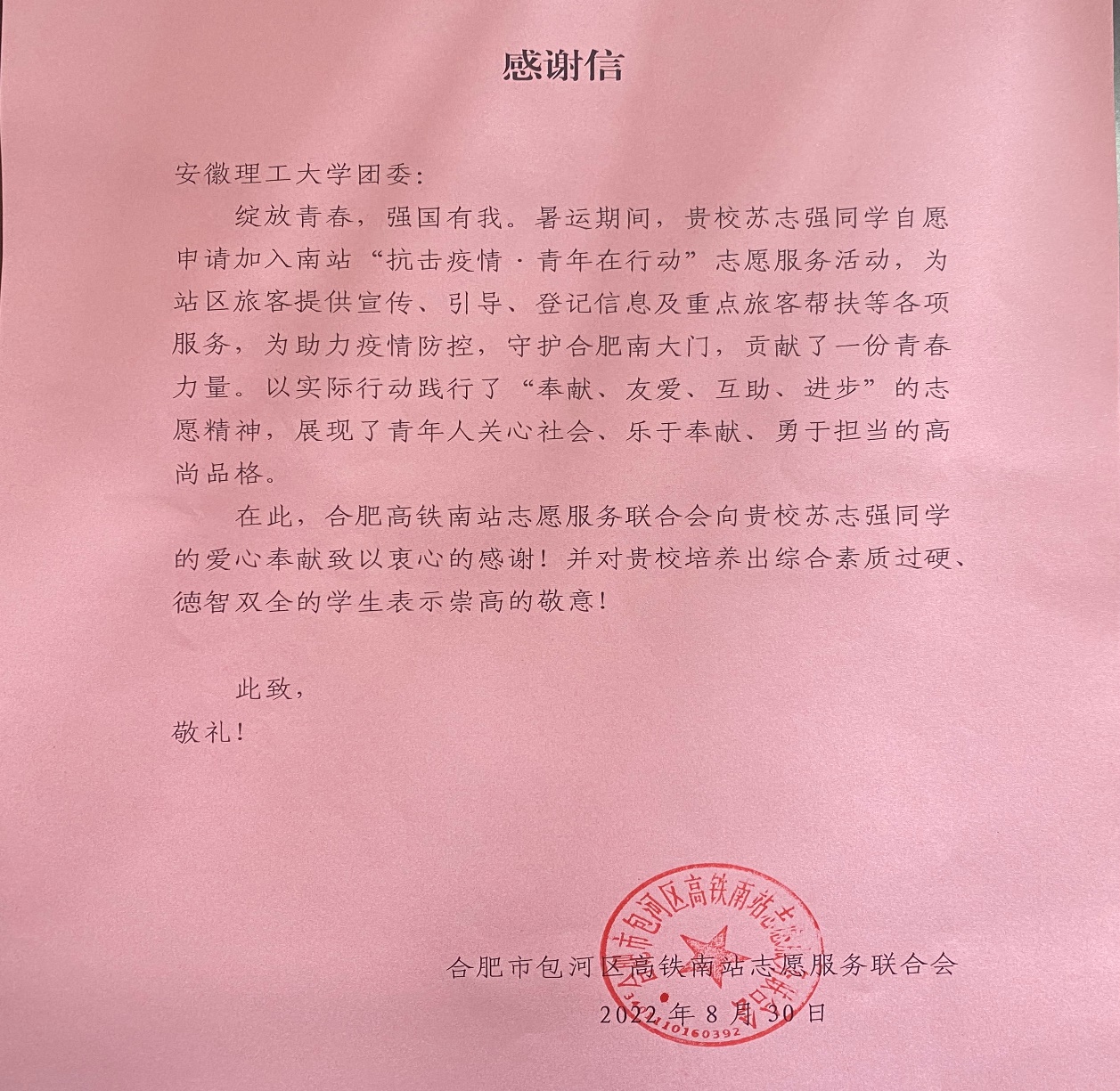 近日,合肥市高铁南站志愿服务联合会给台湾AV影片 寄来了一封感谢信,感谢台湾AV影片 2021级交通工程专业的苏志强同学,在2022暑期奋战抗疫一线,顶高温、冒酷暑,为筑牢疫情防线,打赢疫情防控阻击战贡献了青春力量,彰显了台湾AV影片 学子的责任与担当。