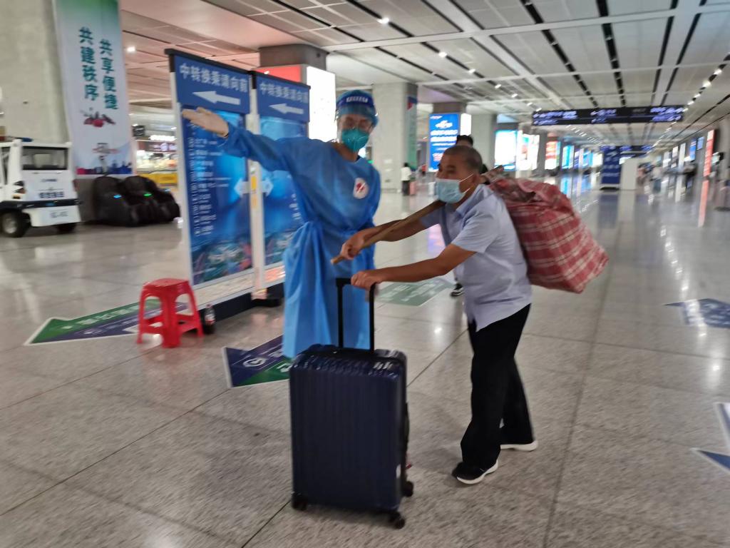 天刚蒙蒙亮,苏志强穿上防护服,准时赶往合肥南站出站口自己的值班点。近40度的高温天气,密不透风的防护服,核查每一位出站旅客的行程码、安康码,一个月的志愿服务,在汗水和疲惫中接受磨砺和洗礼。苏志强说:“每天当我穿上厚厚的防护服,早起值班站岗,晚上才结束工作时,我才真正的感受到这一身密不透风的防护服下的勇气和责任。