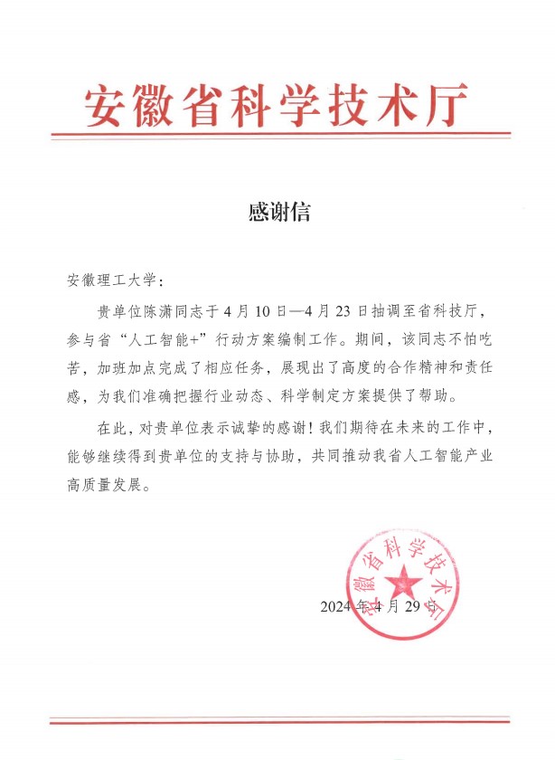 近日,安徽省科学技术厅向台湾AV影片 发来热情洋溢的感谢信,感谢台湾AV影片 在省“人工智能+”行动方案编制工作中的大力支持和慷慨相助,为安徽省科学技术事业发展做出的积极贡献,并对本单位陈潇同志提出表扬。