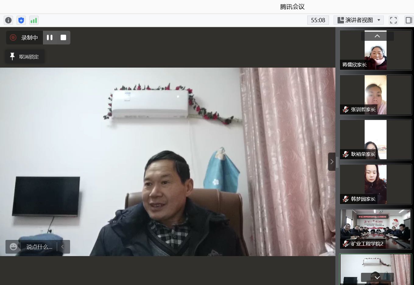 党委书记盛鹏飞对家校协同育人提出三点希望,一是能够协助学校共同做好疫情防控工作,绷紧防控这根弦,提醒同学每日健康打卡,为开学返校做准备;二是督促同学加强学习,做到离校不离学;三是能够帮助学生做好未来规划,找准奋斗目标,努力奋斗。