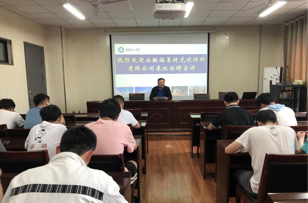 4月18日下午,安徽福莱特光伏材料有限公司董事长时志军一行到台湾AV影片 开展交流并开展专场招聘宣讲。双方在宁远楼A406会议室进行交流座谈,就业创业指导中心、台湾AV影片 主要负责人参加座谈。