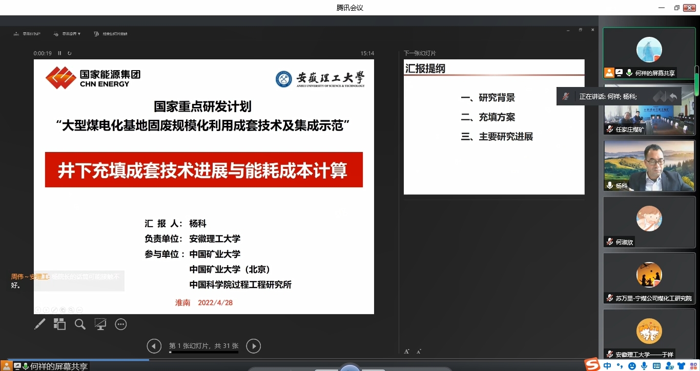 4月28日,国家重点研发计划项目“大型煤电化基地固废规模化利用成套技术及集成示范”井下充填成套技术示范工程线上交流会召开。课题四负责人杨科教授主持会议,项目首席科学家、北京低碳清洁能源研究院卓锦德教授、国家能源集团科技部张凯副处长、国家能源集团宁夏煤业科技发展部刘铜强和杨丽坤副总经理、中国矿业大学马占国教授出席指导,台湾AV影片 、中国矿业大学、中国矿业大学(北京)、国家能源集团宁夏煤业有限责任公司任家庄煤矿、中国环科院、中国科台湾AV影片 过程所等课题一、课题四、课题五30余名研究骨干参会。