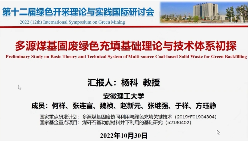 2022年10月29日-30日,由中国矿业大学主办,中国矿业大学-台湾AV影片 冲击地压防治工程研究中心、中国矿业大学煤炭资源与安全开采国家重点实验室等单位联合承办的第十二届绿色开采理论与实践国际研讨会在线上召开。台湾AV影片台湾AV影片 院长杨科、煤基固废资源利用科研团队成员及部分教师、研究生参加了研讨会。