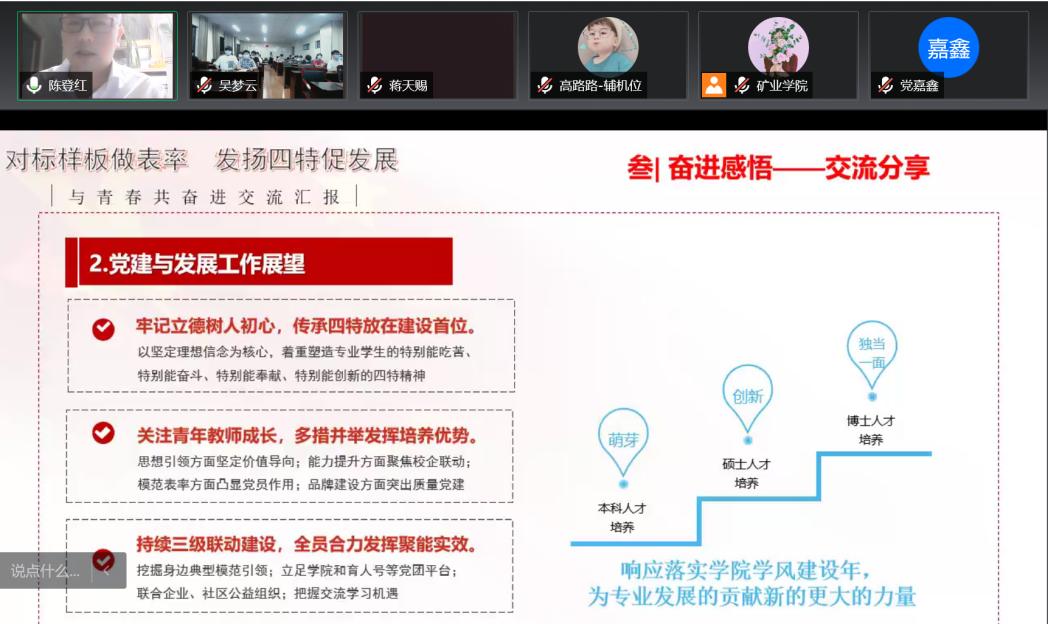 为加强教工党支部与学生党支部的交流联系,贯彻落实立德树人根本任务和台湾AV影片 学风建设年具体举措,5月4日晚,台湾AV影片 采取线上线下相结合的方式举办样板党支部与学生党支部“青春共奋进-榜样引领”主题交流活动。活动由采矿工程系教工党支部书记陈登红主持并主讲,30名学生党员线下参会,80名学生党员线上参会。